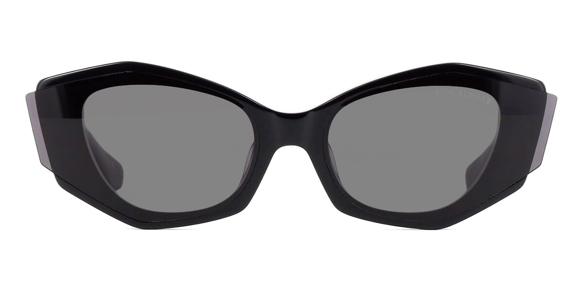 This cat eye Dita sunglass comes in a shiny black frame with grey with light mirror lenses.