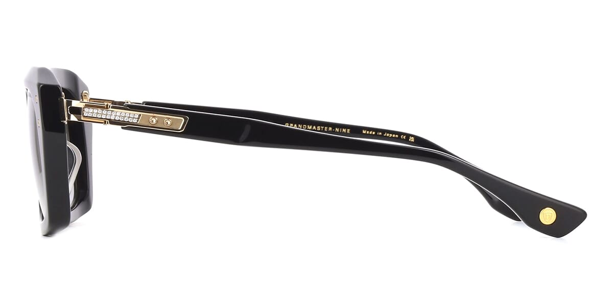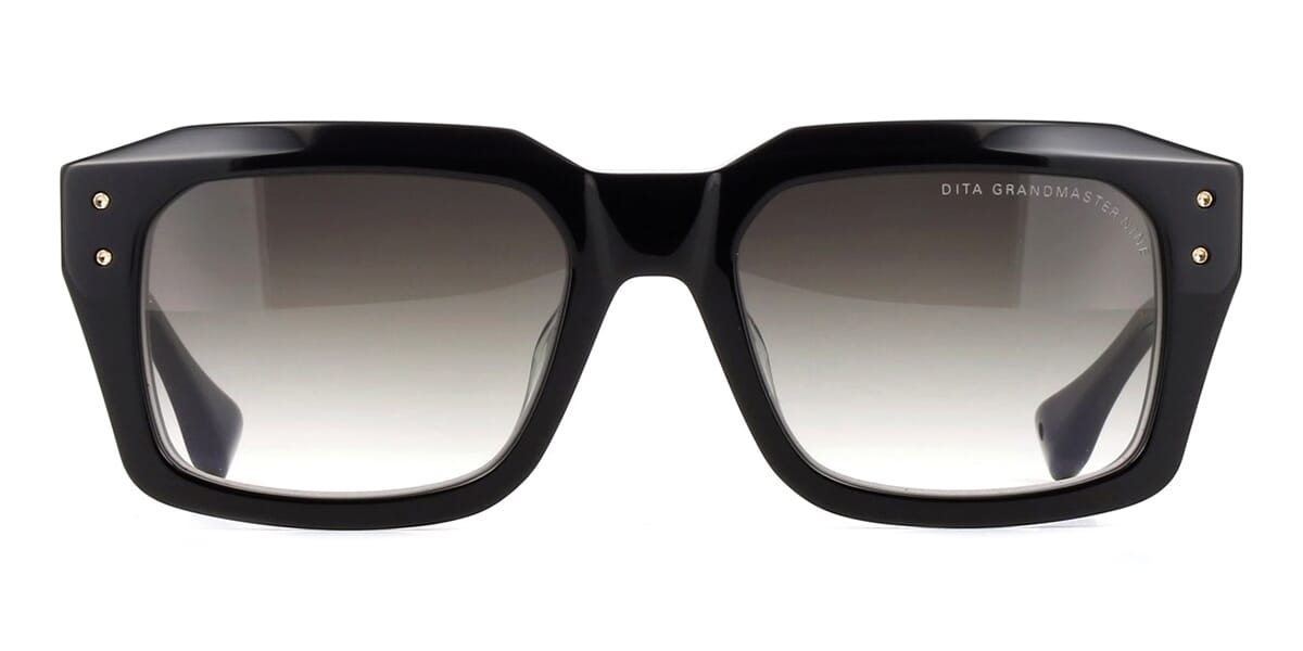 This square Dita sunglass comes in a shiny black with hand-placed real white diamonds mounted on solid 18k gold temple frame with grey to clear gradient lenses.