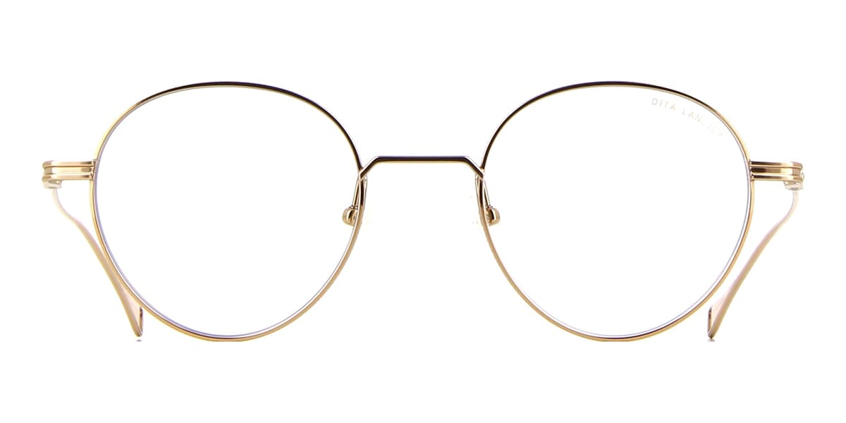 This round Dita Lancier optical comes in a shiny gold sand frame.