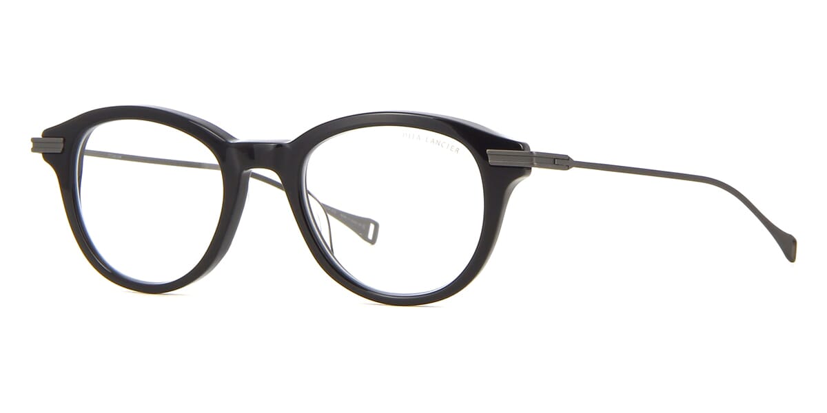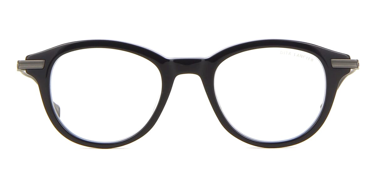 This round Dita Lancier optical comes in a shiny black and gunmetal frame.
