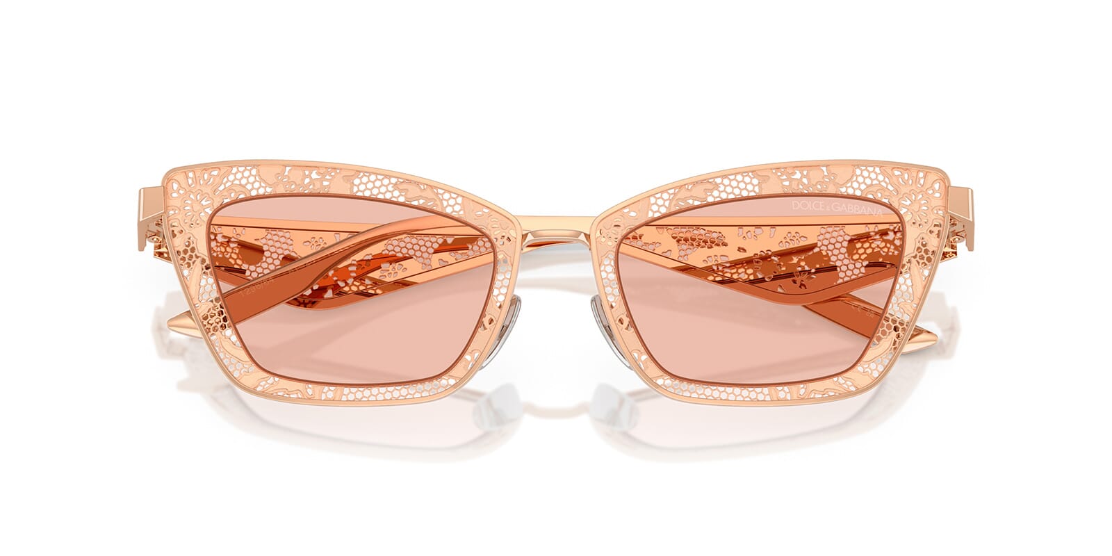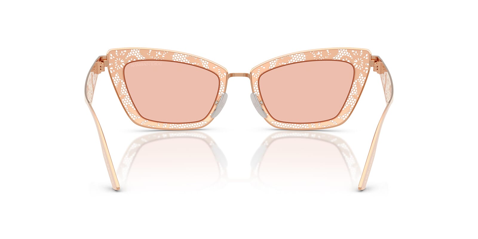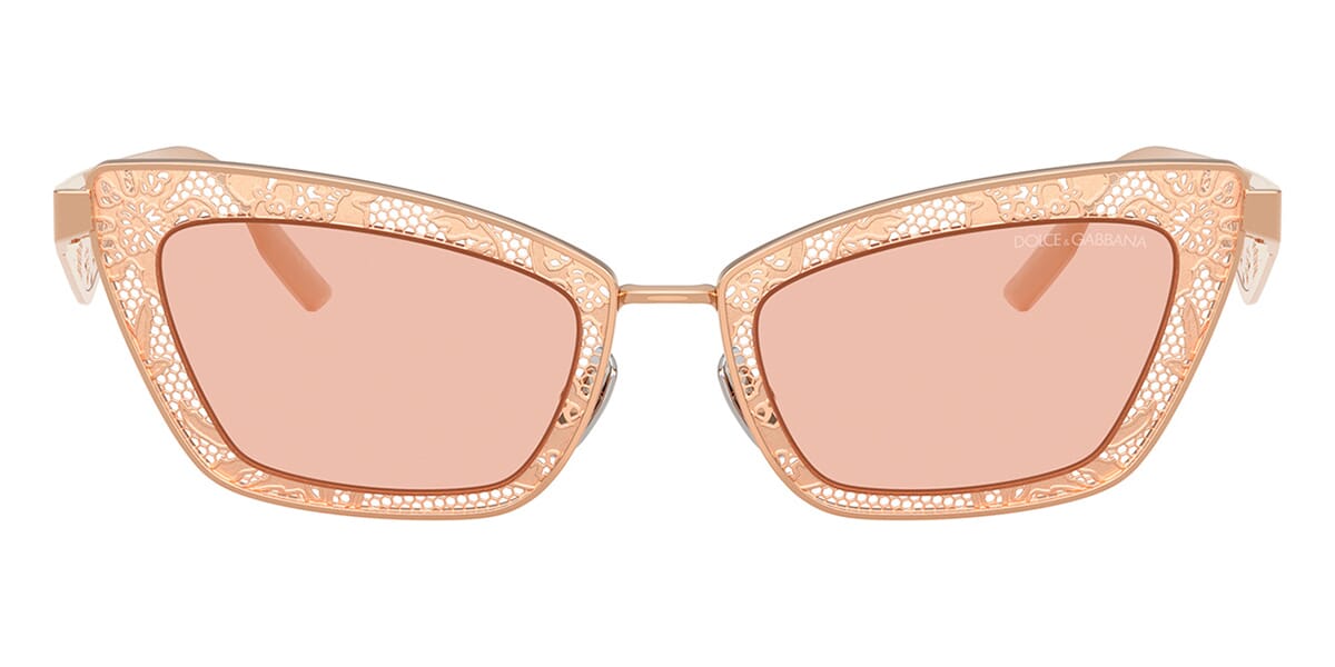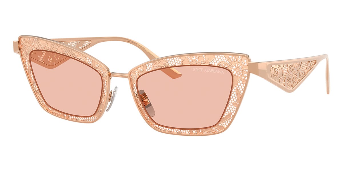 This cat eye Dolce&Gabbana sunglass comes in a rose gold frame with dark pink lenses.