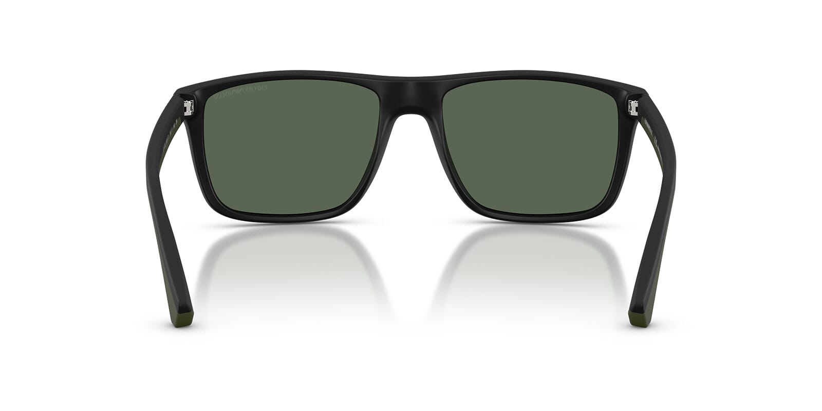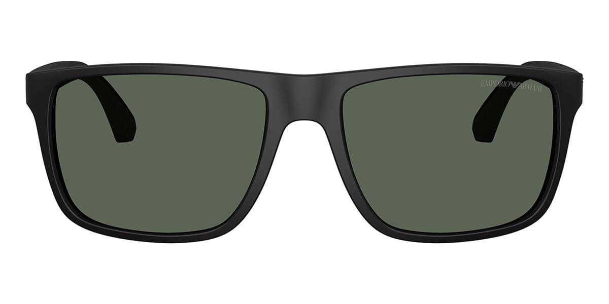This square Emporio Armani sunglass comes in a matte black frame with dark green lenses.