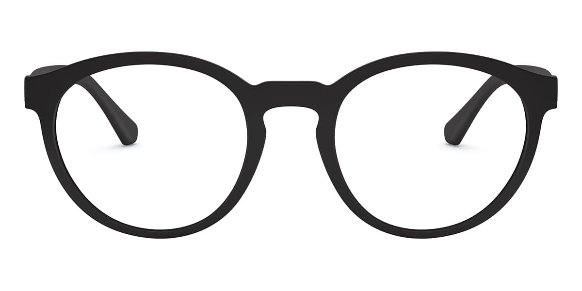 This round Emporio Armani sunglass comes in a matte black frame with clear uv lenses.