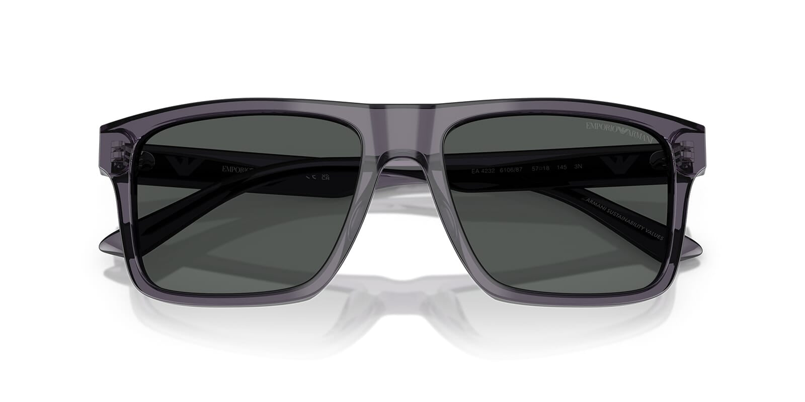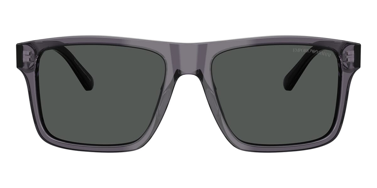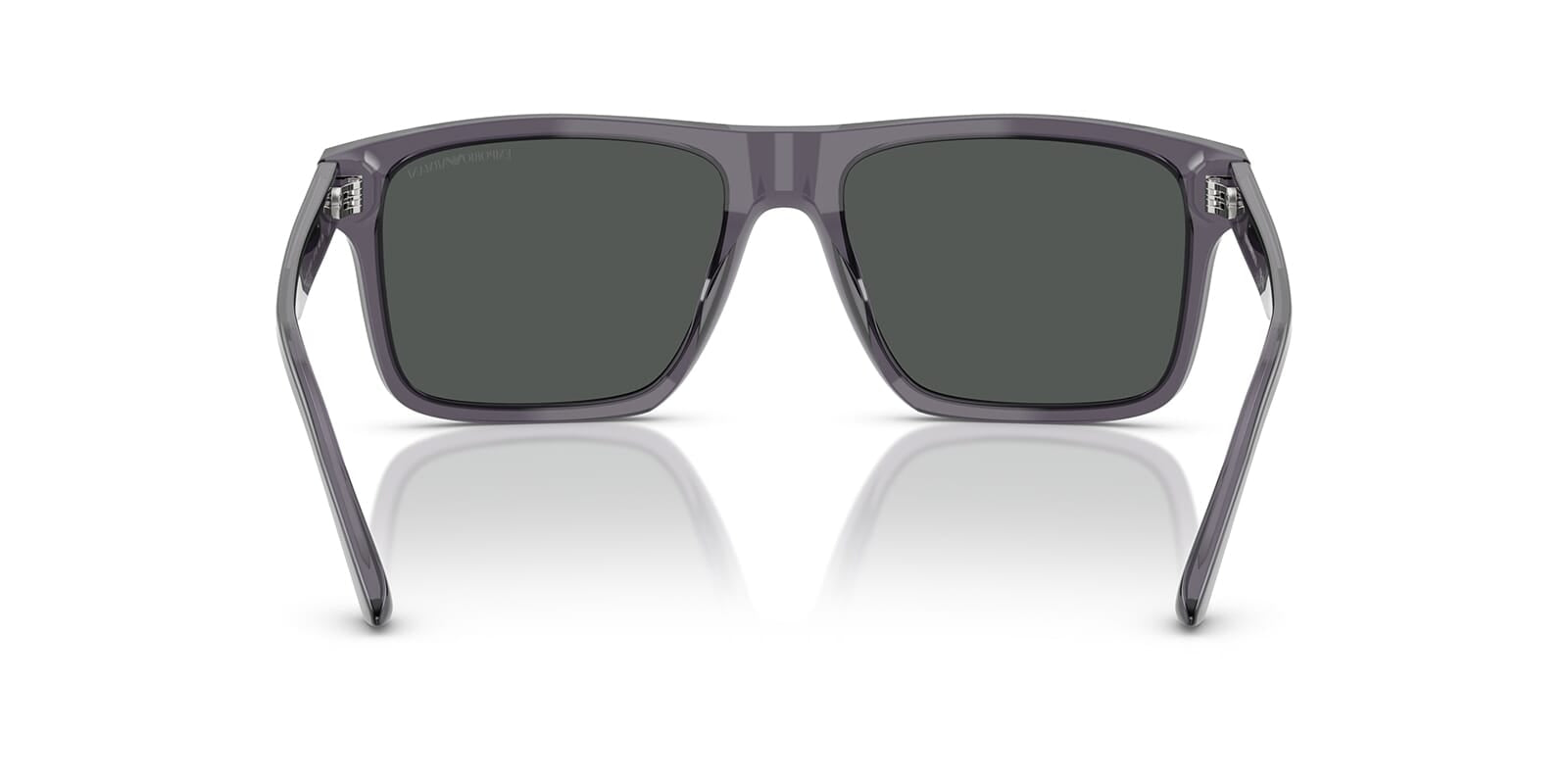 This square Emporio Armani sunglass comes in a transparent dark grey frame with smoke grey lenses.
