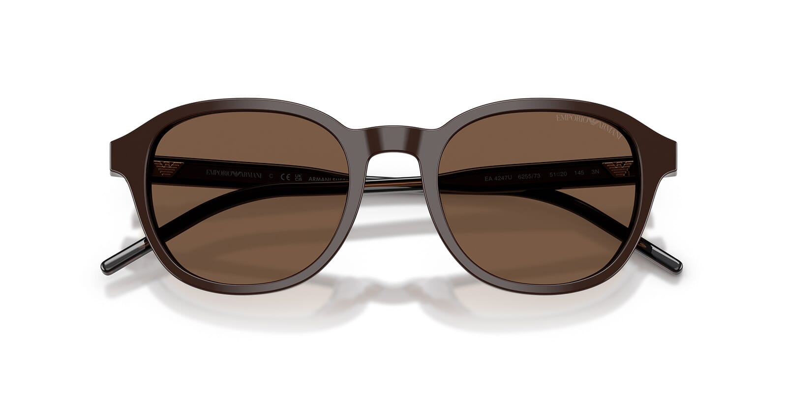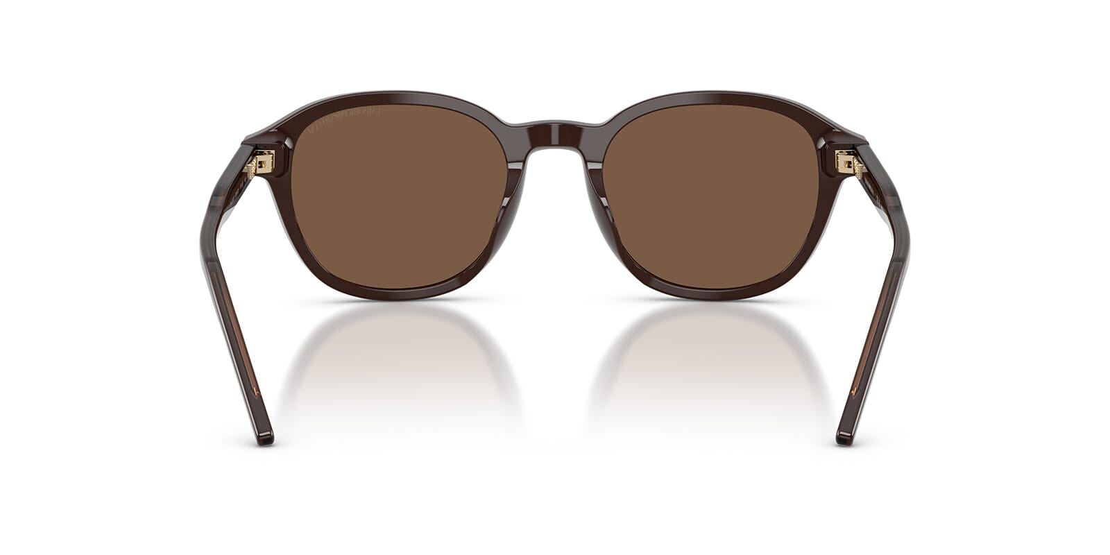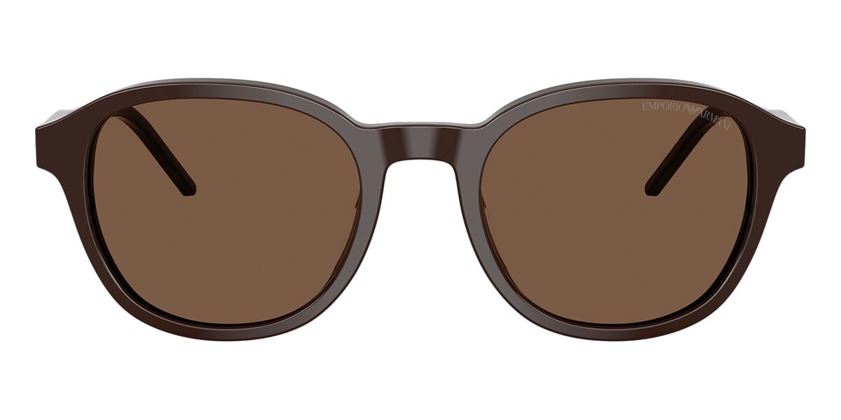 This round Emporio Armani sunglass comes in a shiny brown frame with brown lenses.