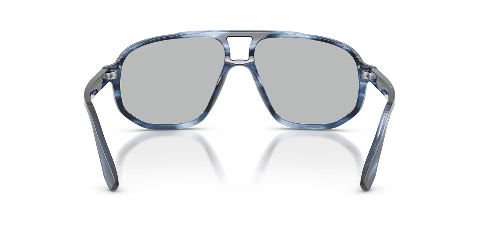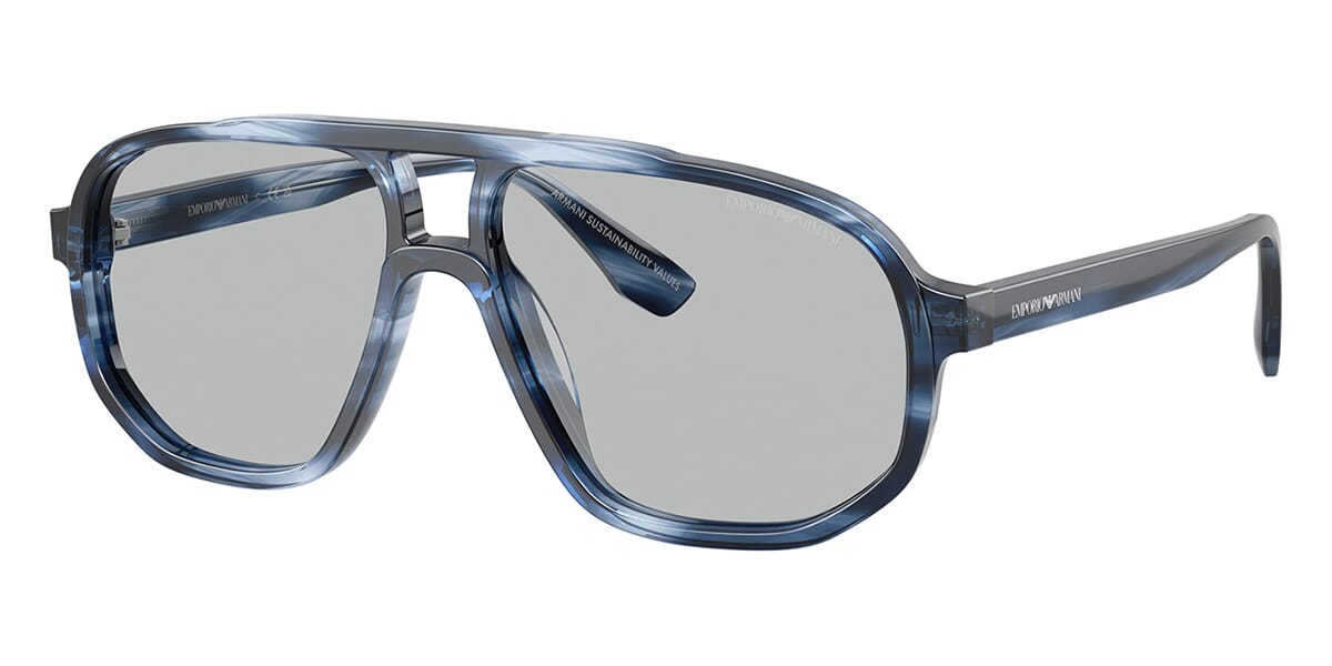 This aviator Emporio Armani sunglass comes in a striped dark blue frame with light grey lenses.
