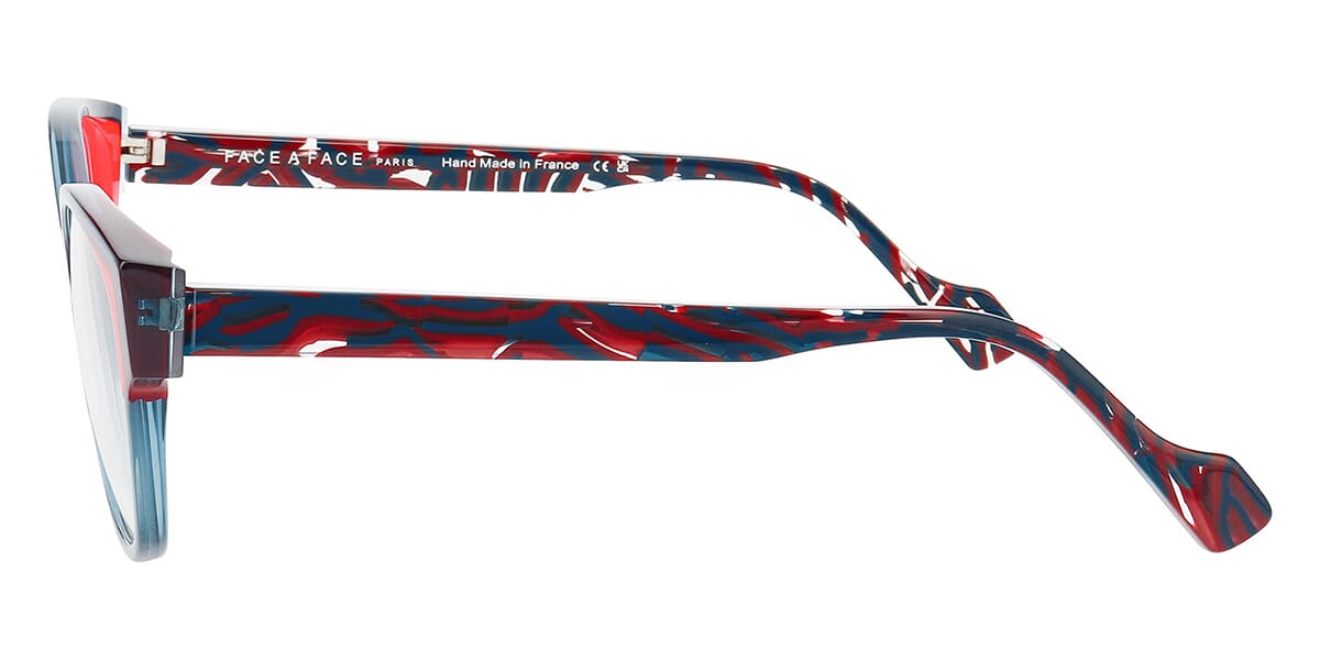 This square Face A Face optical comes in a transparent petrol with havana and red frame.