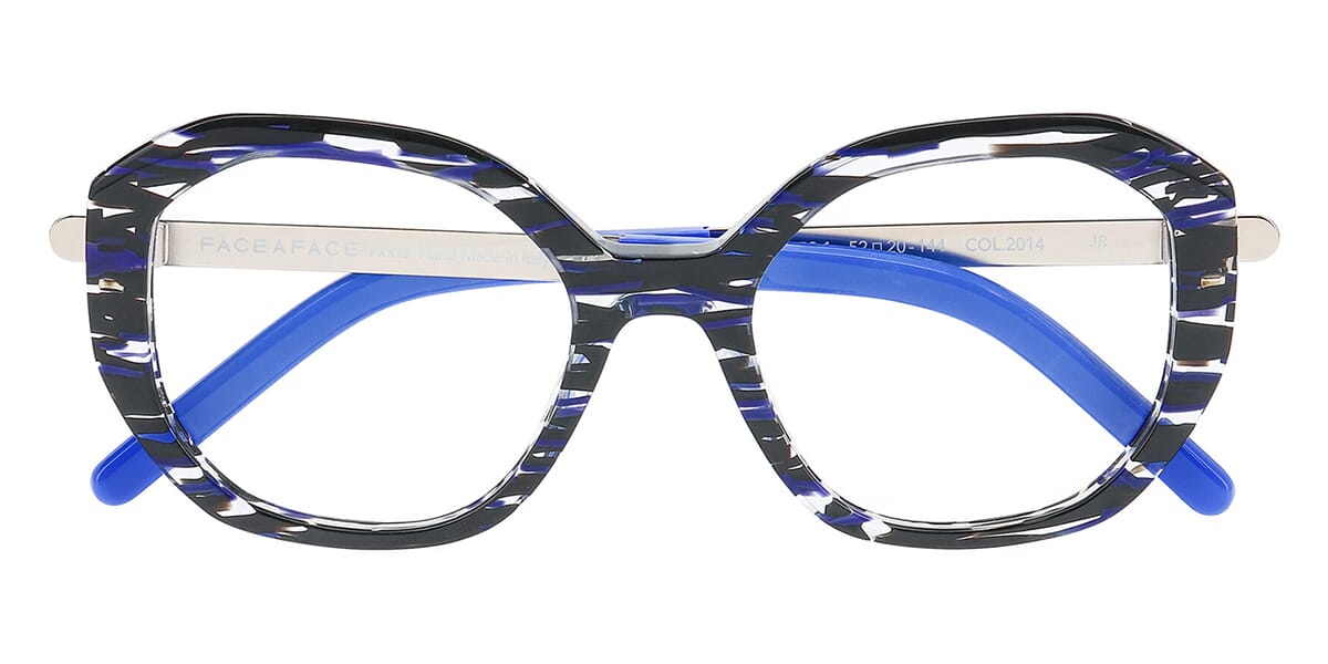This square Face A Face optical comes in a crystal black striped with silver and blue frame.