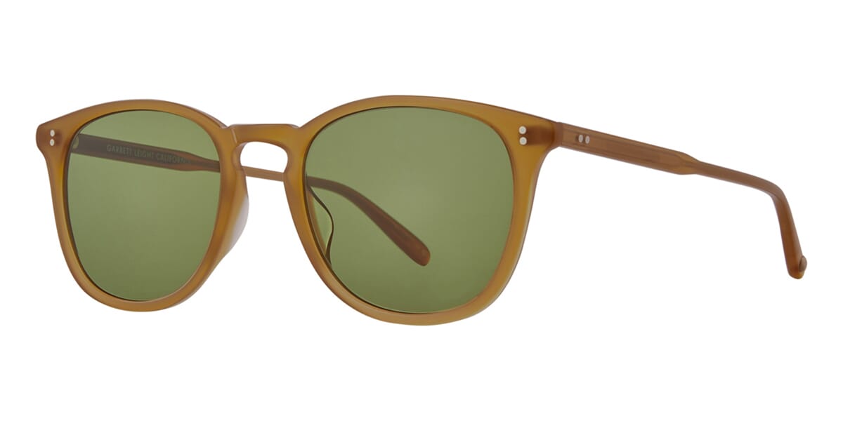 This square Garrett Leight sunglass comes in a summer sun brown frame with pure green lenses.