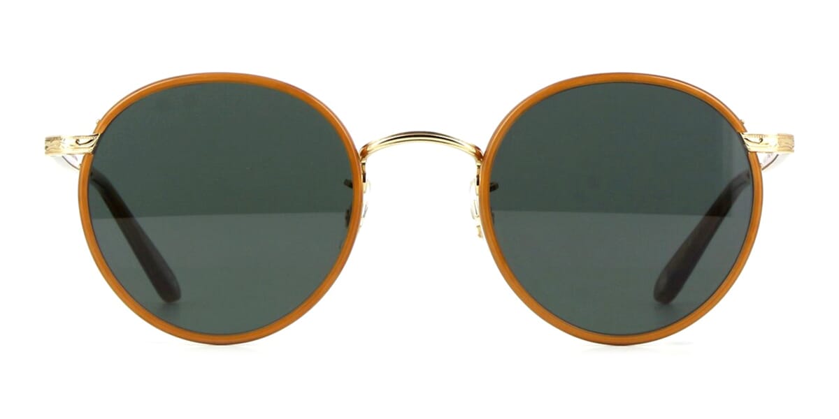 This round Garrett Leight sunglass comes in a carmel gold frame with semi-flat pure blue smoke lenses.