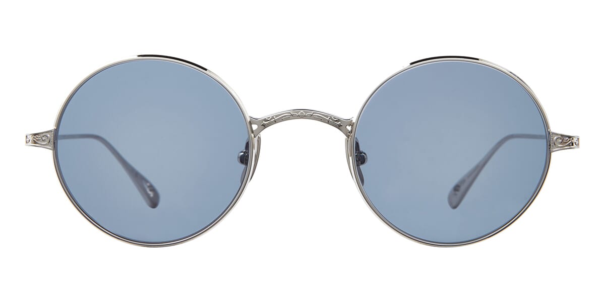 This round Garrett Leight sunglass comes in a platinum frame with indigo lenses.