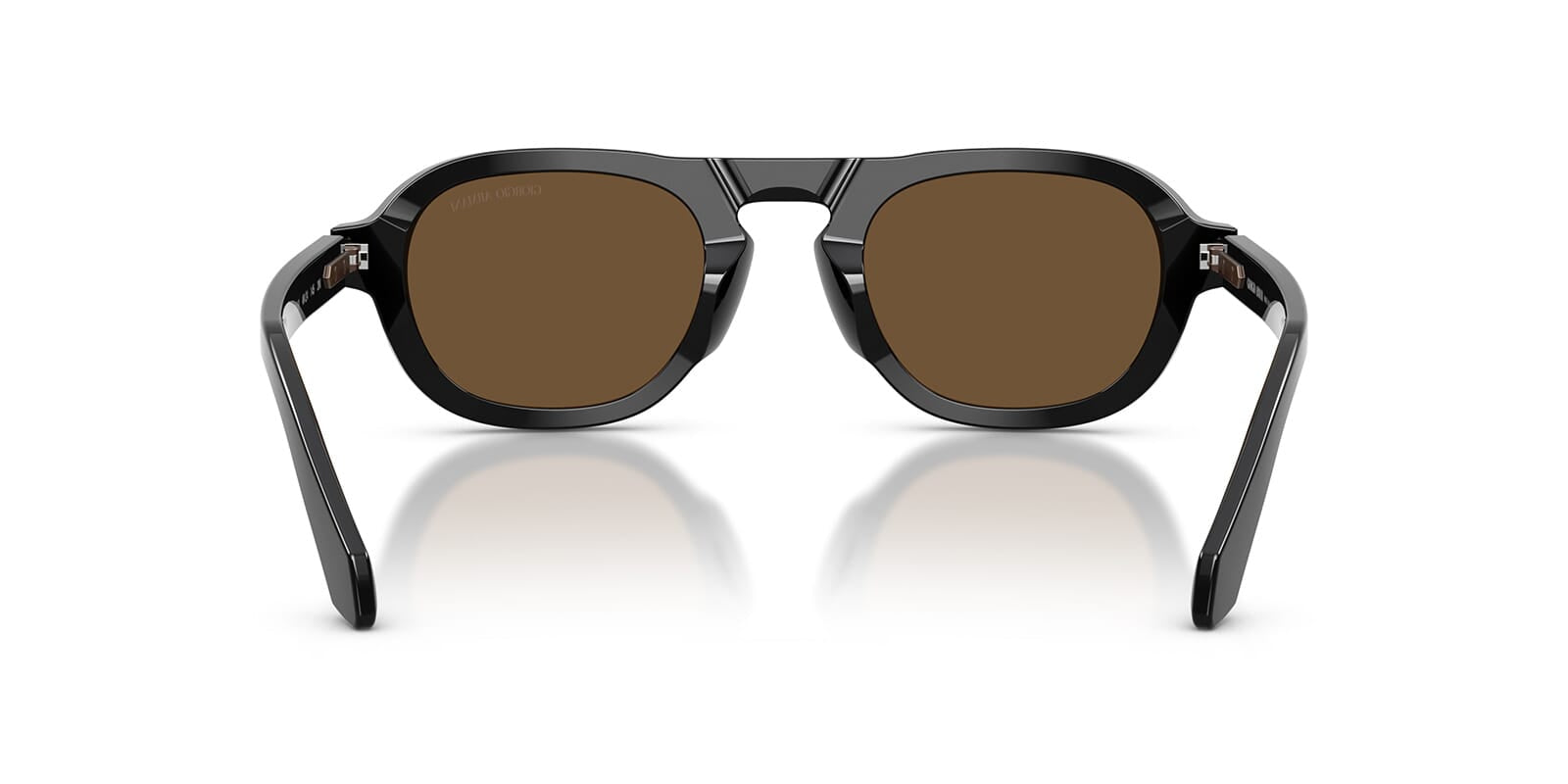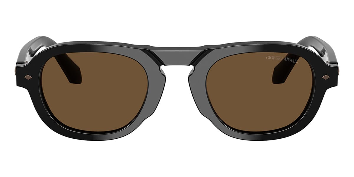 This round Giorgio Armani sunglass comes in a black frame with dark brown lenses.