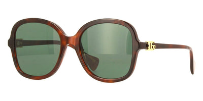 This square Gucci sunglass comes in a brown havana frame with green lenses.