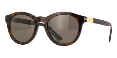 This round Gucci sunglass comes in a shiny black frame with grey lenses.