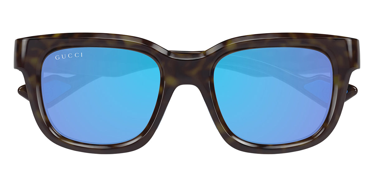 This square Gucci sunglass comes in a brown havana frame with blue with blue mirror lenses.