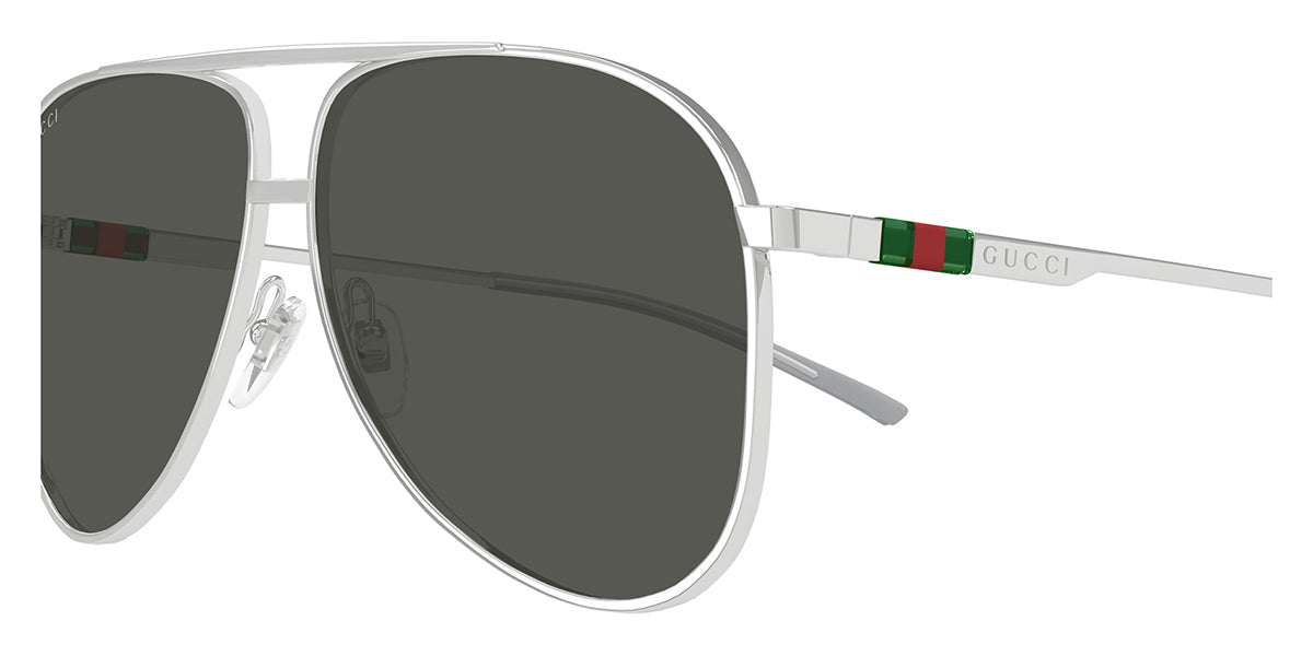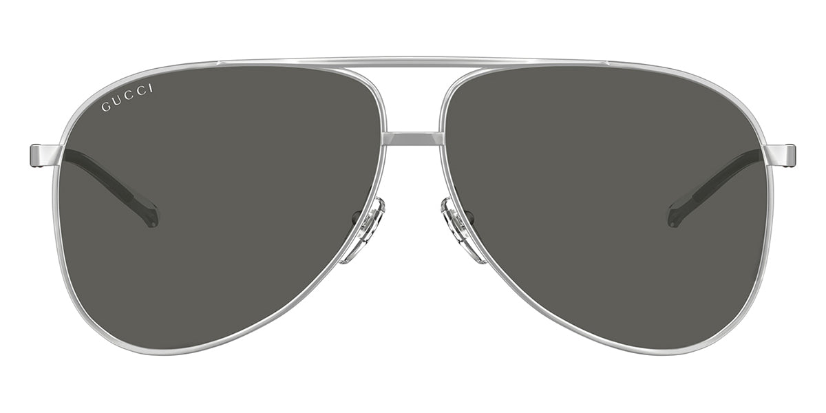 This aviator Gucci sunglass comes in a silver frame with grey lenses.