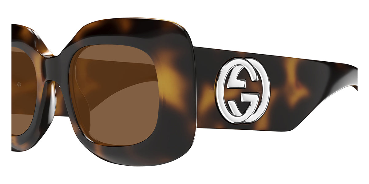 This square Gucci sunglass comes in a havana frame with brown lenses.
