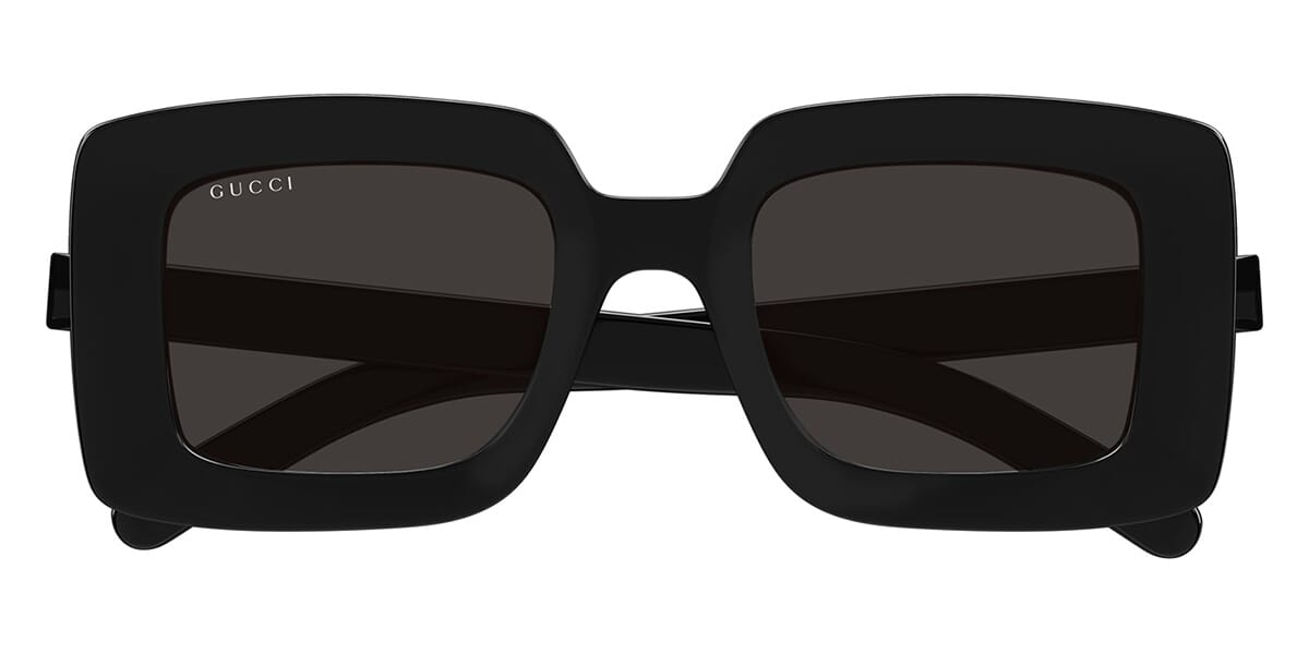 This square Gucci sunglass comes in a black frame with grey lenses.