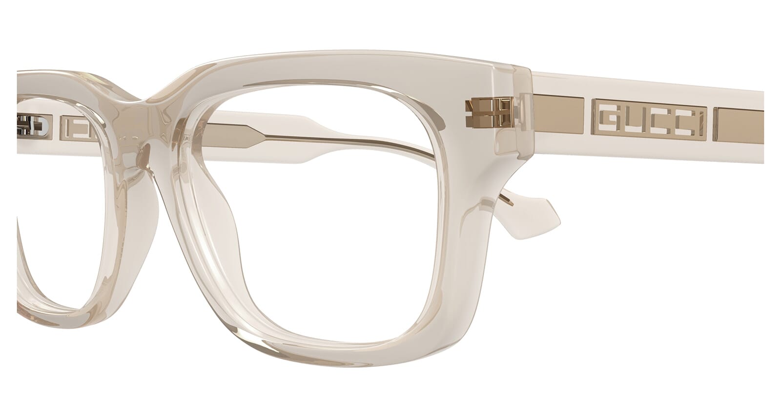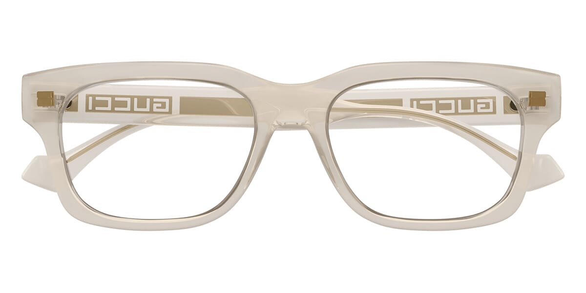 This square Gucci optical comes in a crystal pale khaki green frame.