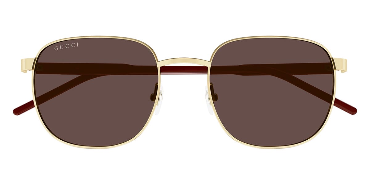 This square Gucci sunglass comes in a gold with burgundy frame with brown lenses.