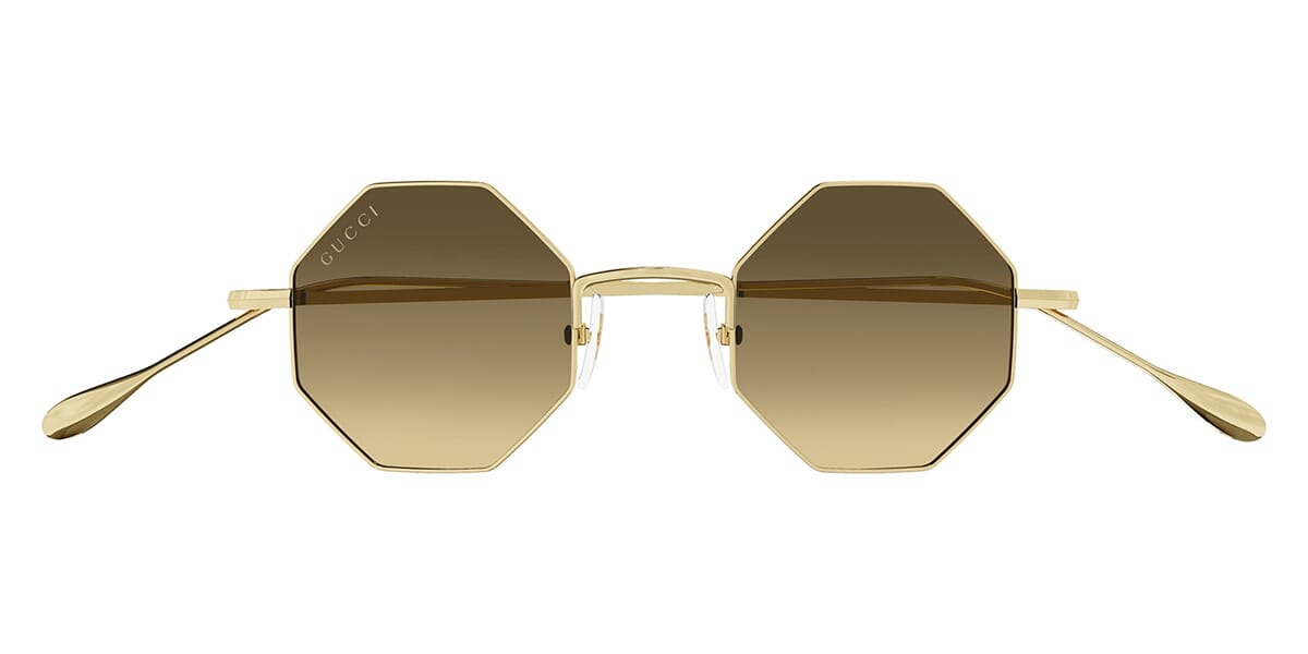 This square Gucci sunglass comes in a gold frame with brown lenses.