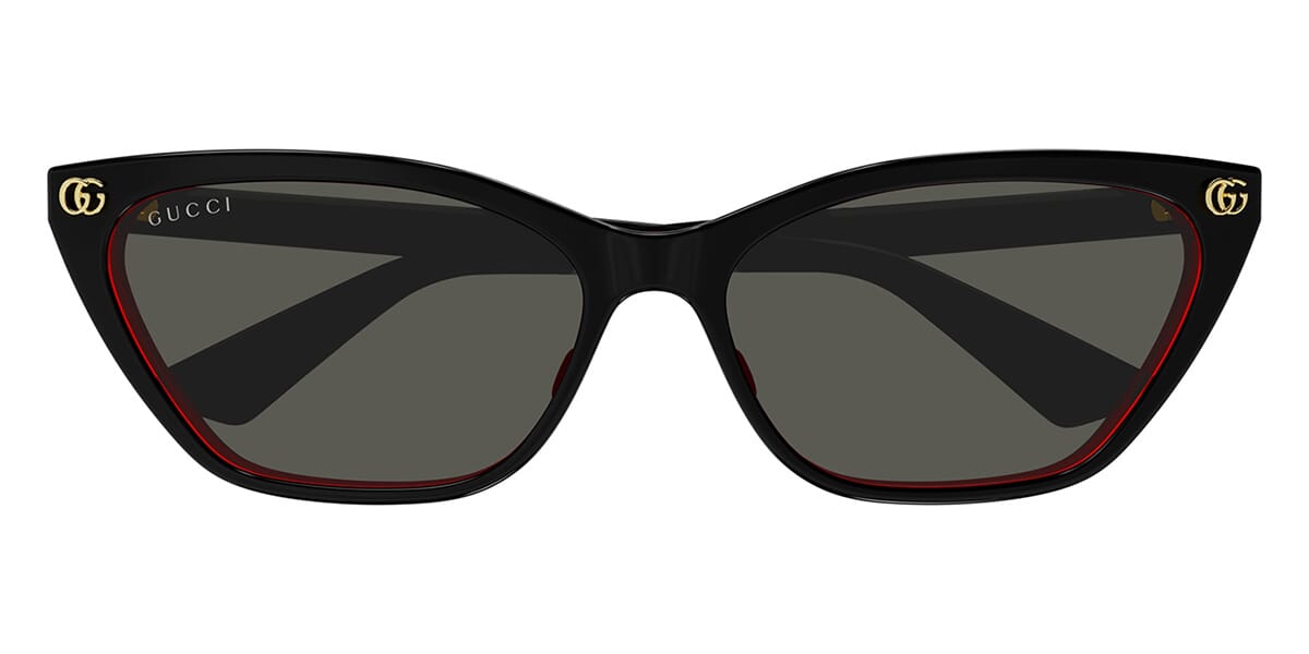 This cat eye Gucci sunglass comes in a black frame with grey lenses.