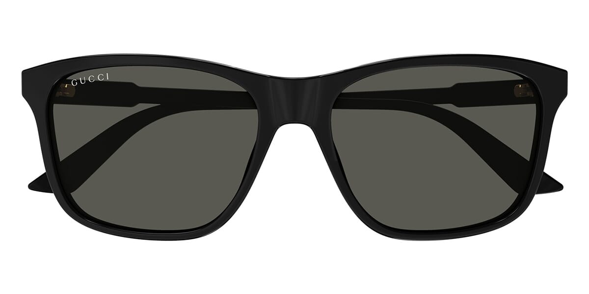 This square Gucci sunglass comes in a shiny black frame with grey lenses.