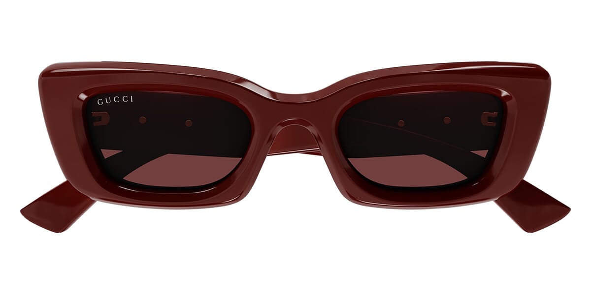 This cat eye Gucci sunglass comes in a burgundy frame with red lenses.