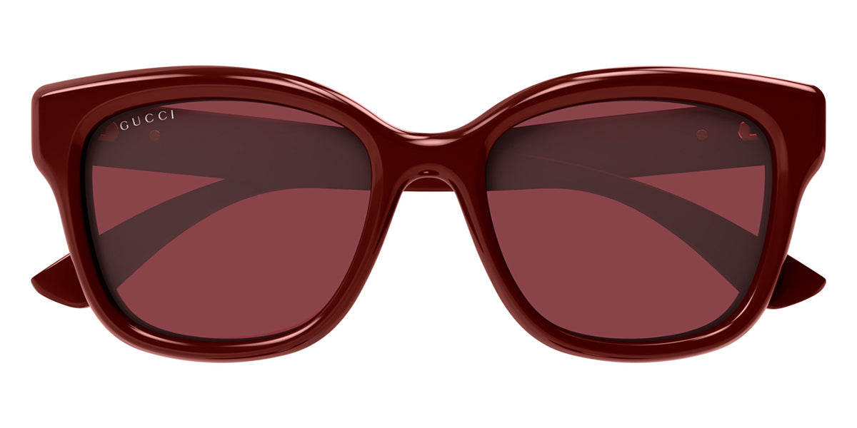 This square Gucci sunglass comes in a burgundy frame with red lenses.