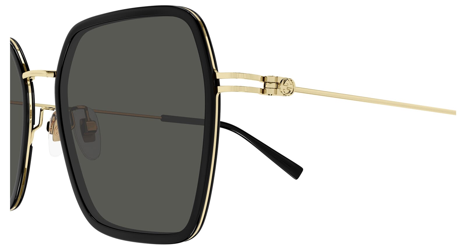 This square Gucci sunglass comes in a shiny black with gold frame with grey lenses.