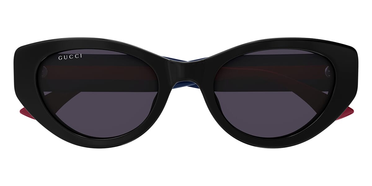 This cat eye Gucci sunglass comes in a black with blue frame with violet lenses.