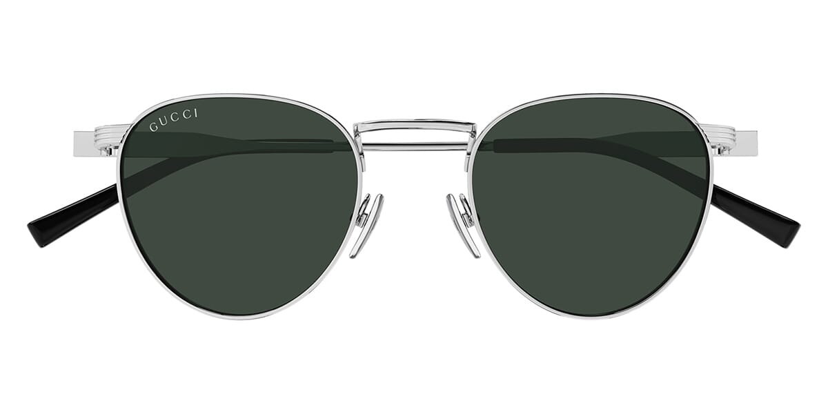 This square Gucci sunglass comes in a silver frame with green lenses.