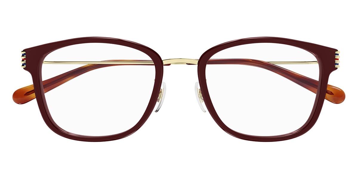 This square Gucci optical comes in a burgundy with gold frame.