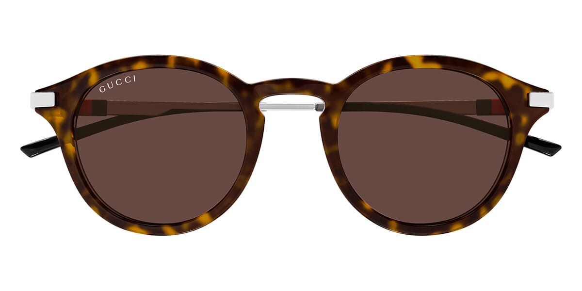 This round Gucci sunglass comes in a shiny dark havana and silver frame with brown with light mirror lenses.