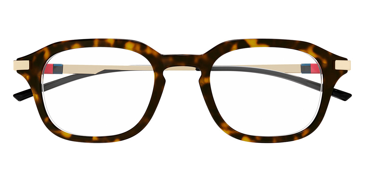 This square Gucci optical comes in a shiny dark havana and gold frame.