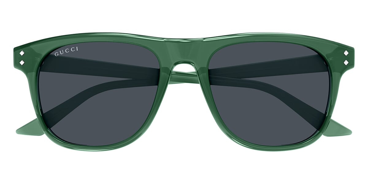 This square Gucci sunglass comes in a shiny crystal bottle green frame with blue lenses.