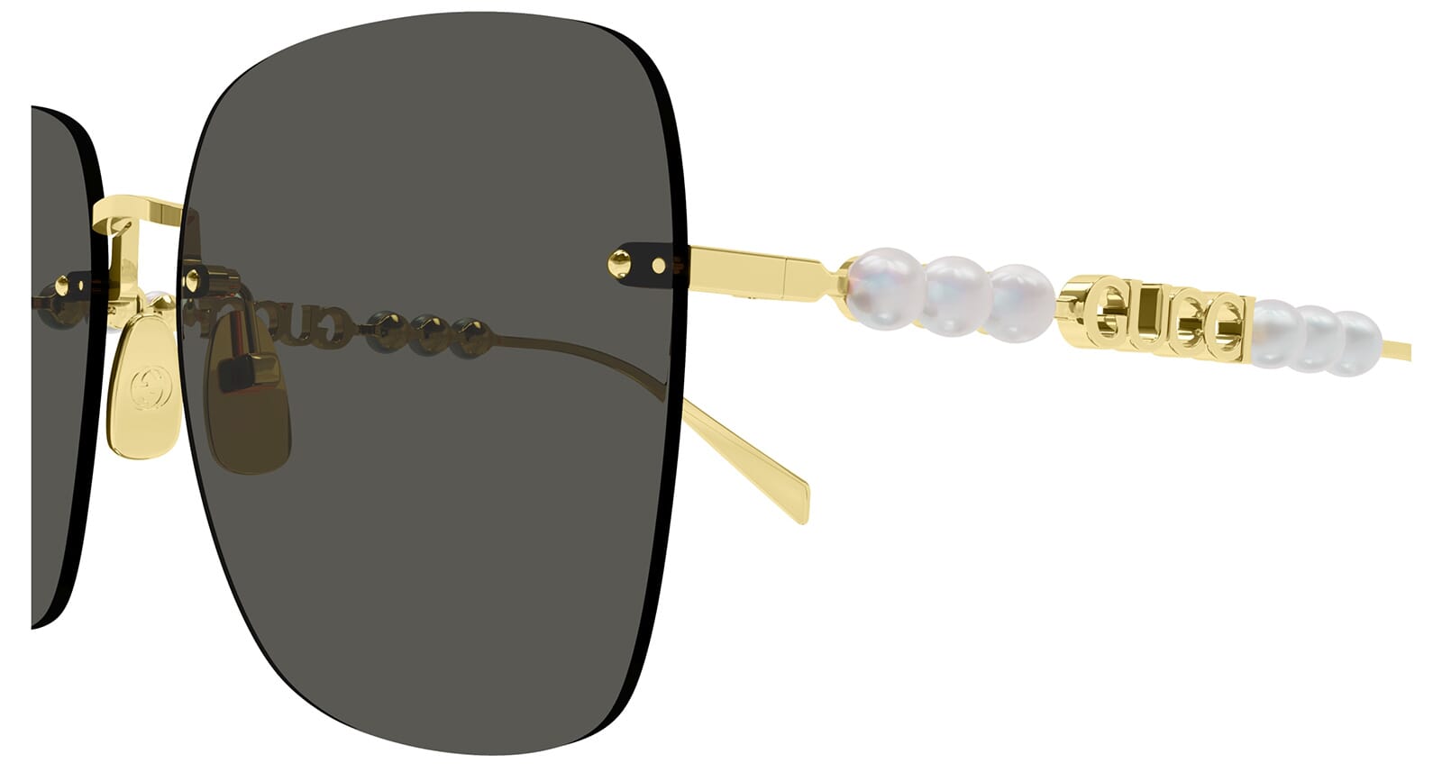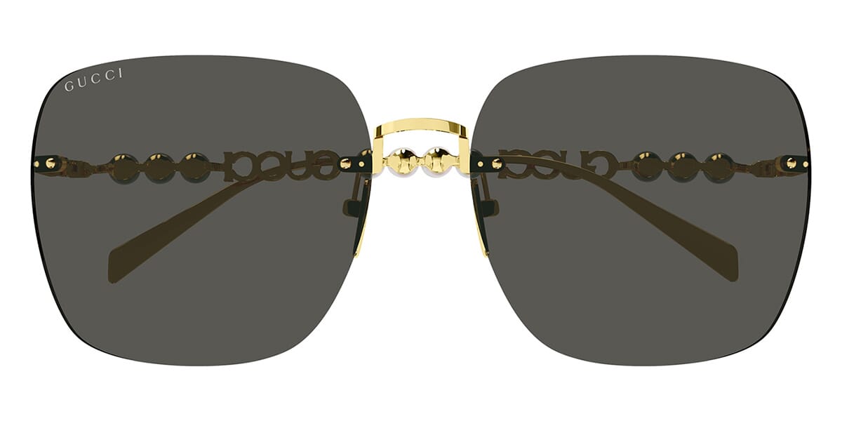 This square Gucci sunglass comes in a gold frame with grey lenses.