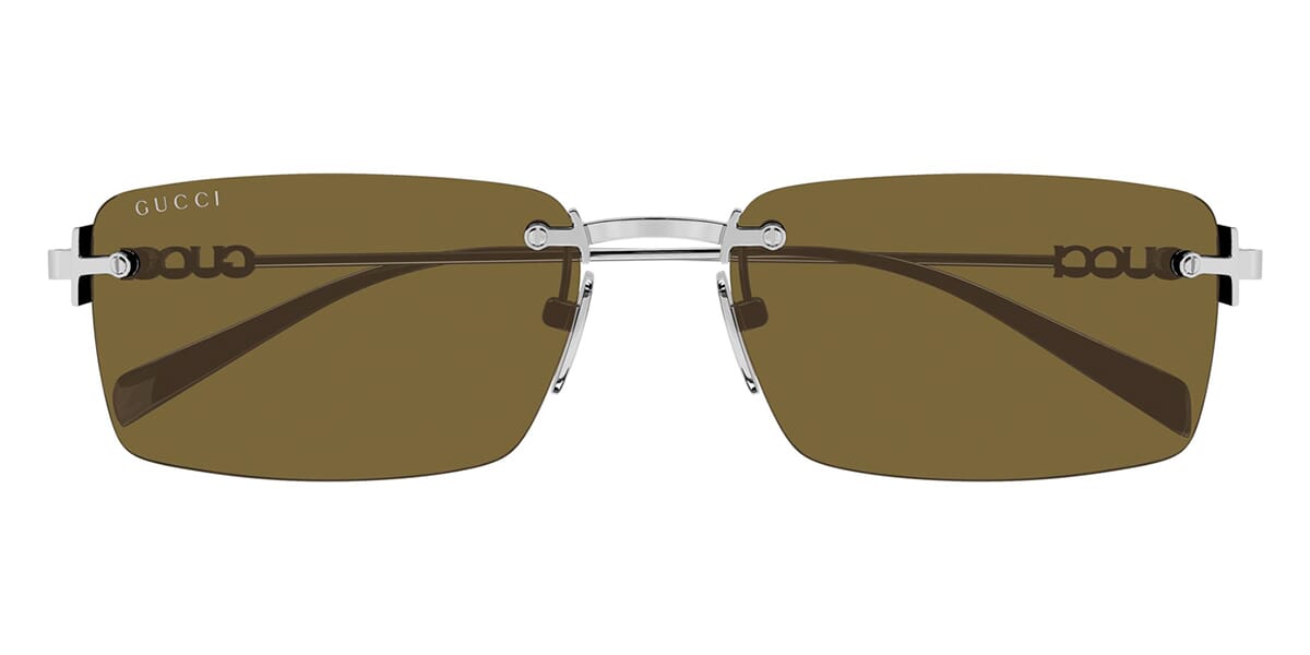 This rectangular Gucci sunglass comes in a shiny silver frame with brown with light mirror lenses.