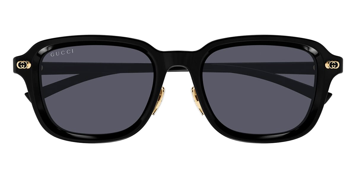 This square Gucci sunglass comes in a black frame with grey lenses.
