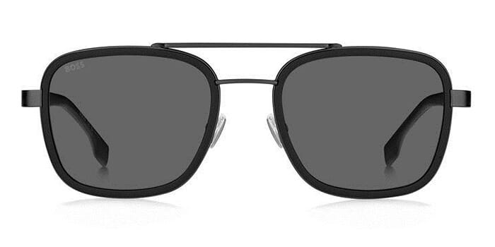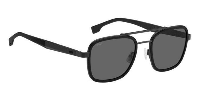 This square Hugo Boss sunglass comes in a matte black frame with grey anti reflection lenses.