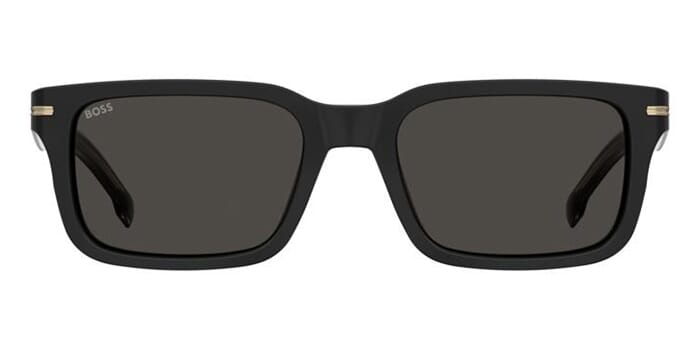 This square Hugo Boss sunglass comes in a black frame with grey lenses.