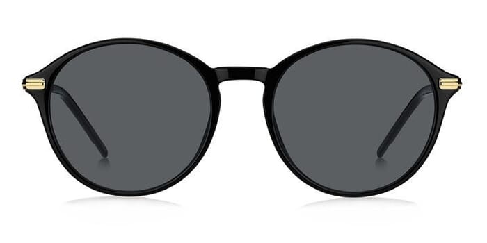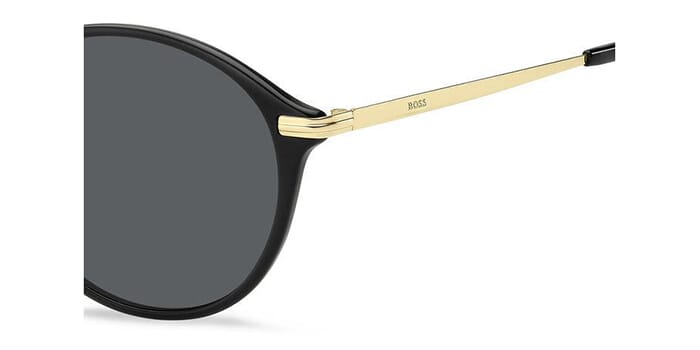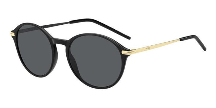 This square Hugo Boss sunglass comes in a black with gold frame with grey lenses.