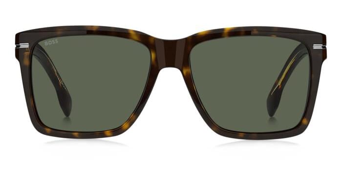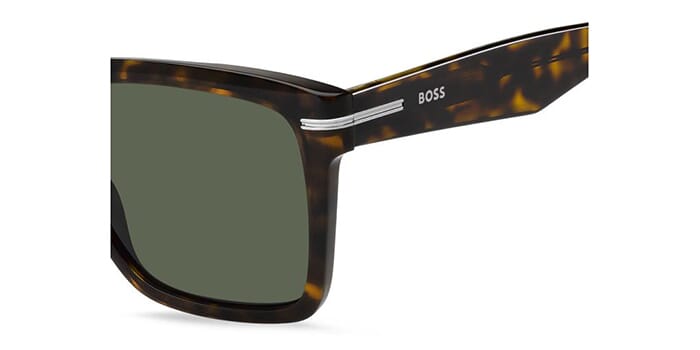 This square Hugo Boss sunglass comes in a dark havana frame with green lenses.