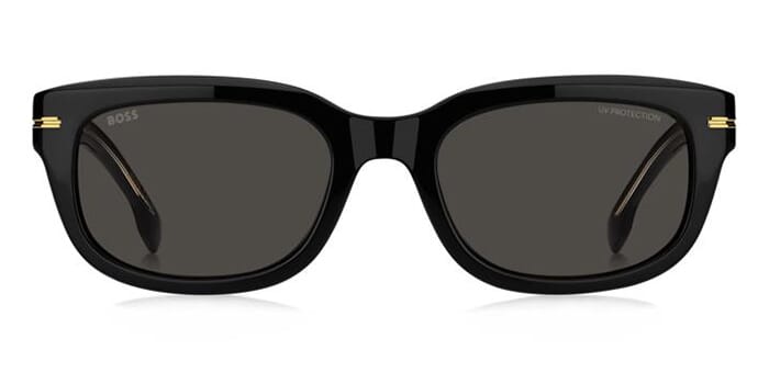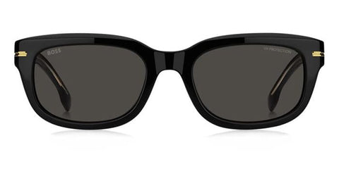 This square Hugo Boss sunglass comes in a black frame with grey lenses.