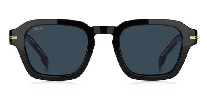 This square Hugo Boss sunglass comes in a black frame with blue lenses.