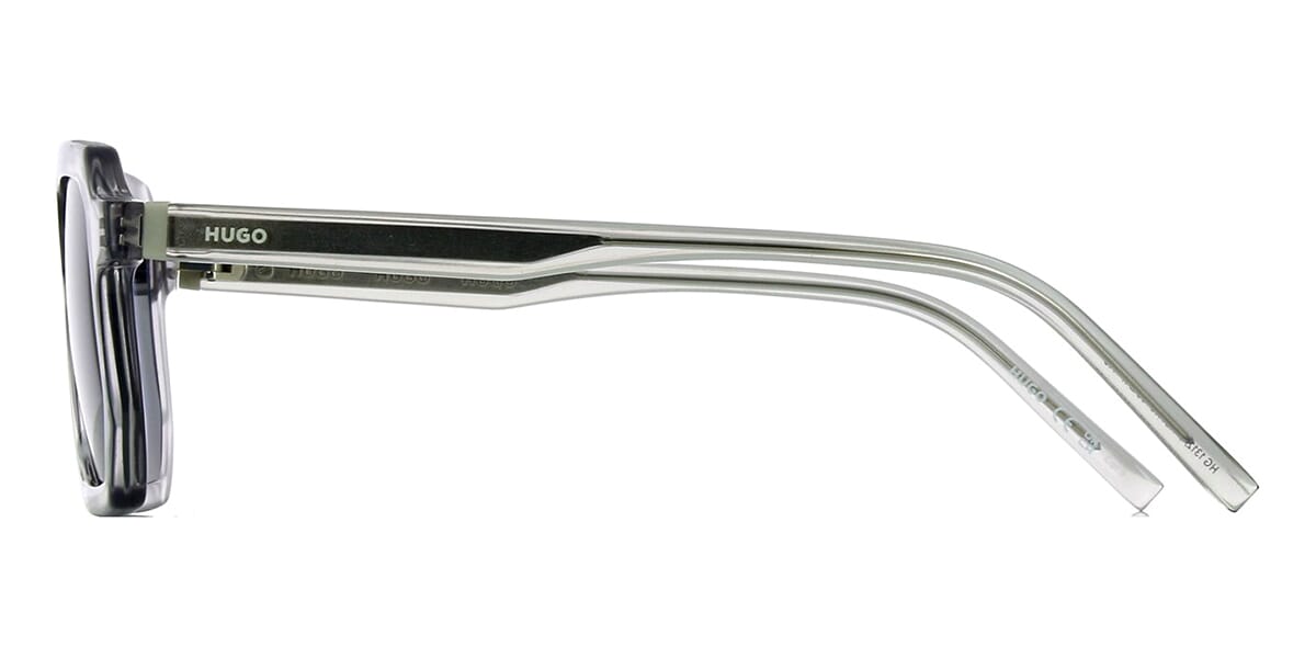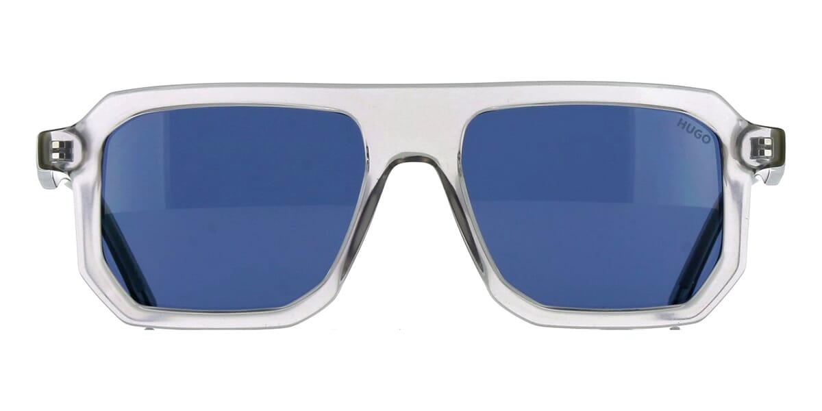 This square Hugo Boss sunglass comes in a grey crystal frame with blue with light mirror lenses.