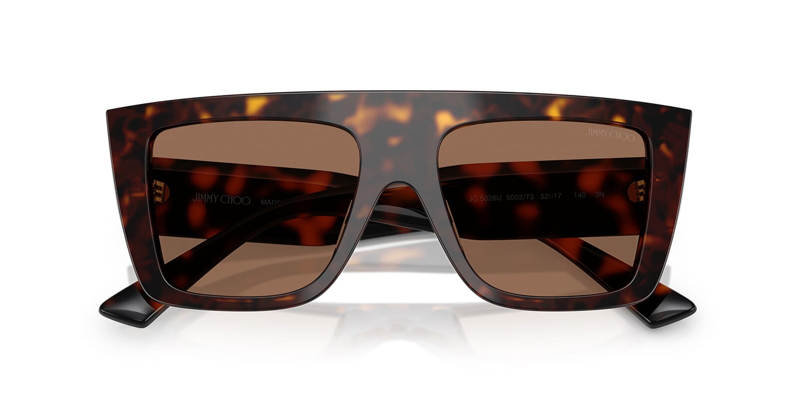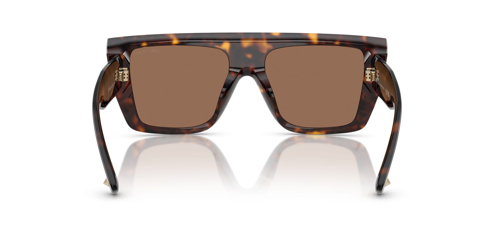 This rectangular Jimmy Choo sunglass comes in a havana frame with dark brown lenses.