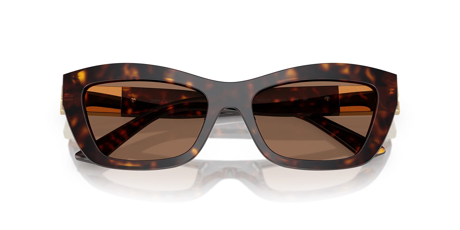 This cat eye Jimmy Choo sunglass comes in a havana frame with dark brown lenses.