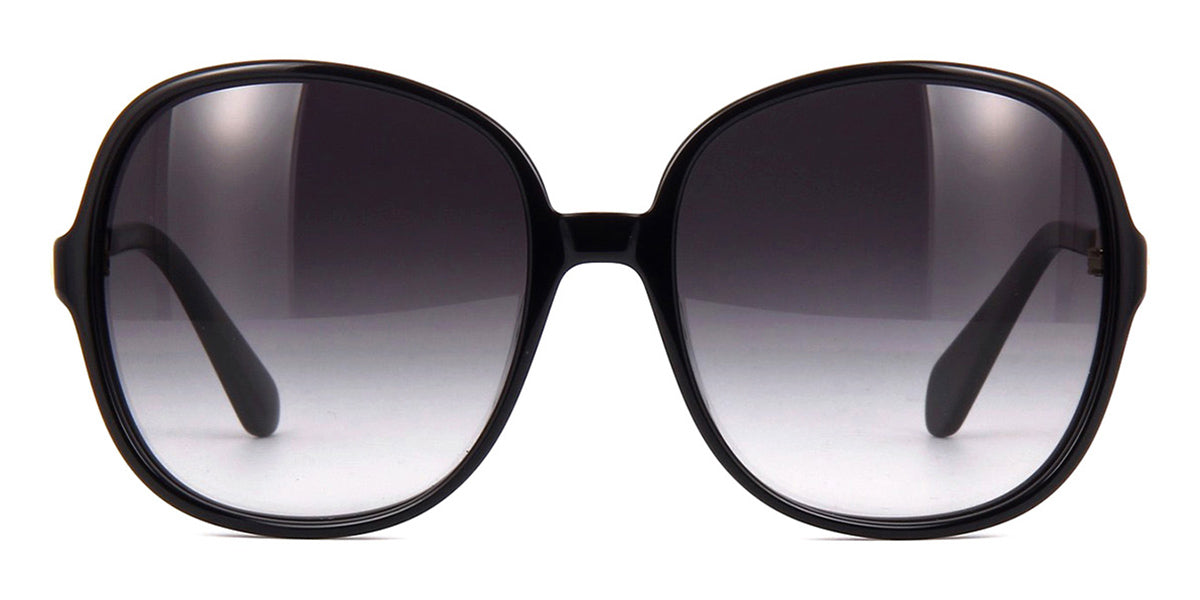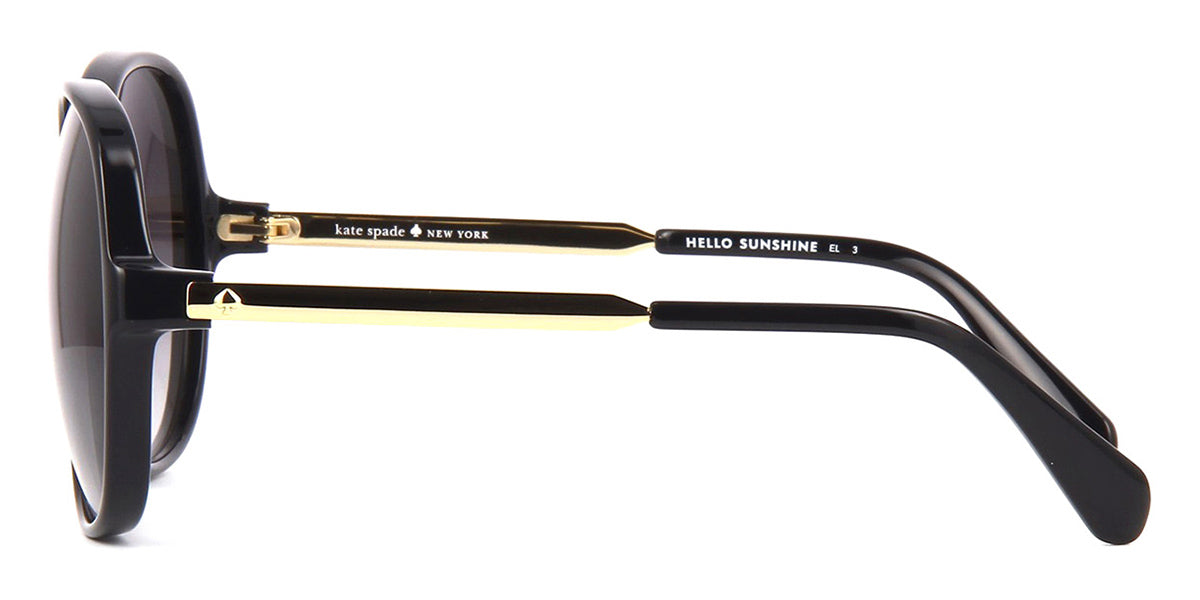 This square Kate Spade sunglass comes in a black/gold frame with grey gradient lenses.