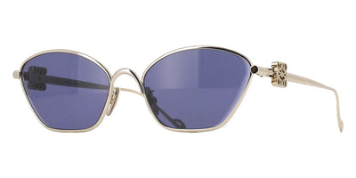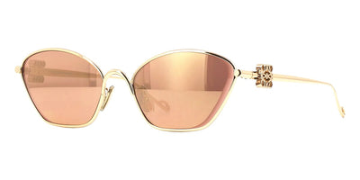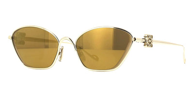 This cat eye Loewe sunglass comes in a shiny gold frame with grey with light mirror lenses.